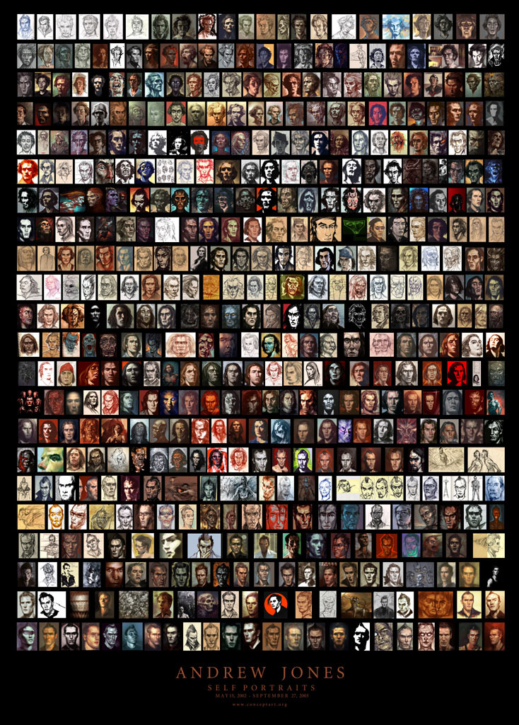 While I was initially amazed at the 500 self portraits Andrew Jones created while practicing his craft... (you can see the 500 poster below), I find his recent release of his 1000 self-portraits poster to be overwhelming. It is hard to imagine all the time and effort that went into these paintings. I remain quite impresed with his work as well as his obvious devotion. I have enjoyed ConceptArt.org immensely since running across it on the net, and recommend it to anyone and everyone. Click on the image to the right to see an extremely large version of his poster. |