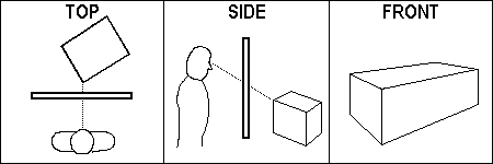 Plane, Placement of the leading edge and the vanishing points are crucial to eliminating any distortion when creating your Design. One Vanishing Point will be nearer to your leading edge than the other. The featured side of the object will be the one with the Vanishing Point furthest away. Referring to the ellipse made with the four points of the Golden Mean, the leading edge must be touching or comfortably inside of the ellipse to avoid distortion. Additionally, the distance from the leading edge to the furthest Vanishing Point should be set at a minimum of twice the distance from the edge to the nearest Vanishing Point. Distortion becomes evident when the angle formed by the lines to the Vanishing Points from either end of the leading edge is less than 90 degrees. (Note: Angles less than 90 degrees indicate that the Design calls for 3 point perspective.) |